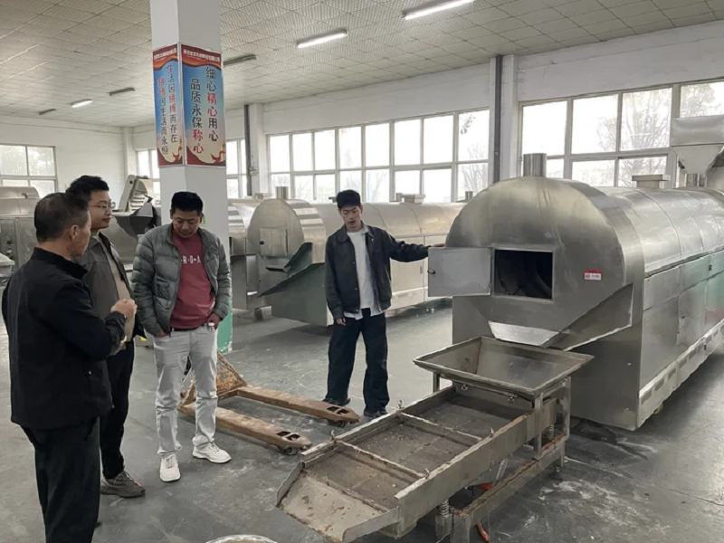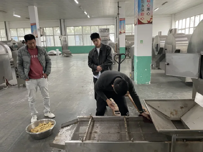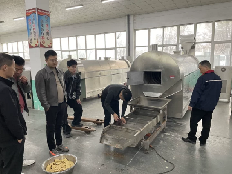 On November 10, 2025, a sunny working day, a group of six people from Luoyang customers arrived by car for several hundred kilometers to Chike Machinery. They brought three large boxes of raw materials and visited the facilities and equipment of the factory workshop, learned about the production processes of various products, and then, under the guidance of the staff, they tested the 4-meter electromagnetic roasting production line to fry puffed foods. After the equipment debugging was successful, the customers successively tested and fried puffed foods such as bitter buckwheat flakes and crispy rice crackers. The finished products were crispy and delicious, with consistent color. The customers were very satisfied with the test results.
