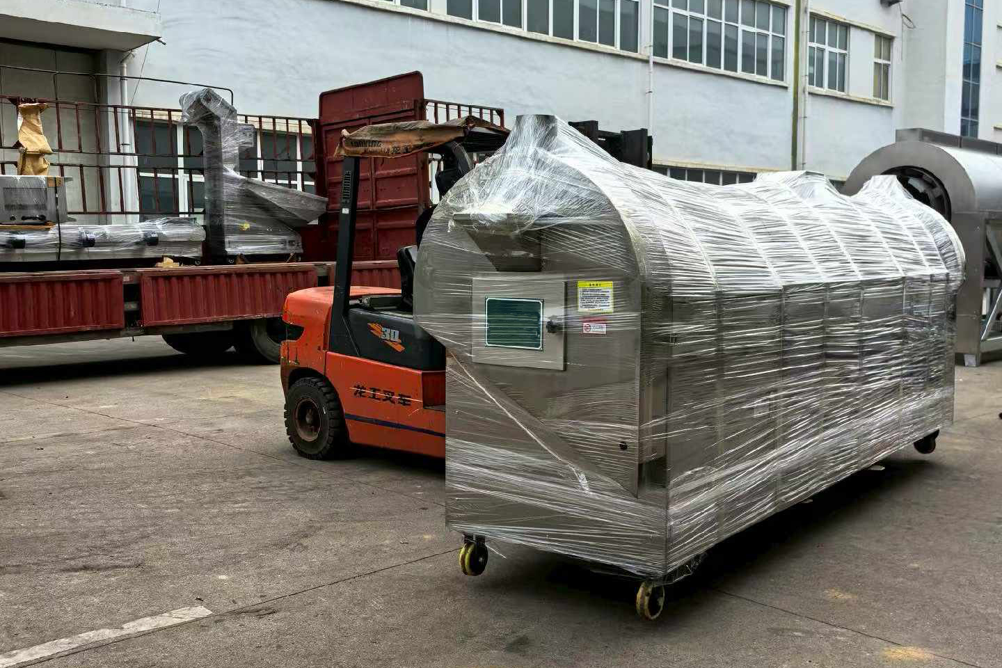On March 24, 2026, the sky was clear and the wind was gentle, with bright sunshine. It was another energetic working day. The workshop of Chike Machinery was bustling with activity. A brand-new four-meter continuous electromagnetic roasting equipment for food had completed its delivery, testing, and packaging. The staff pushed the packed machines to the shipping area, and with the help of the forklift driver, they loaded them onto the logistics shipping vehicle and sent them to the customer's factory in Wuhan, Hubei Province, for roasting seasonings.